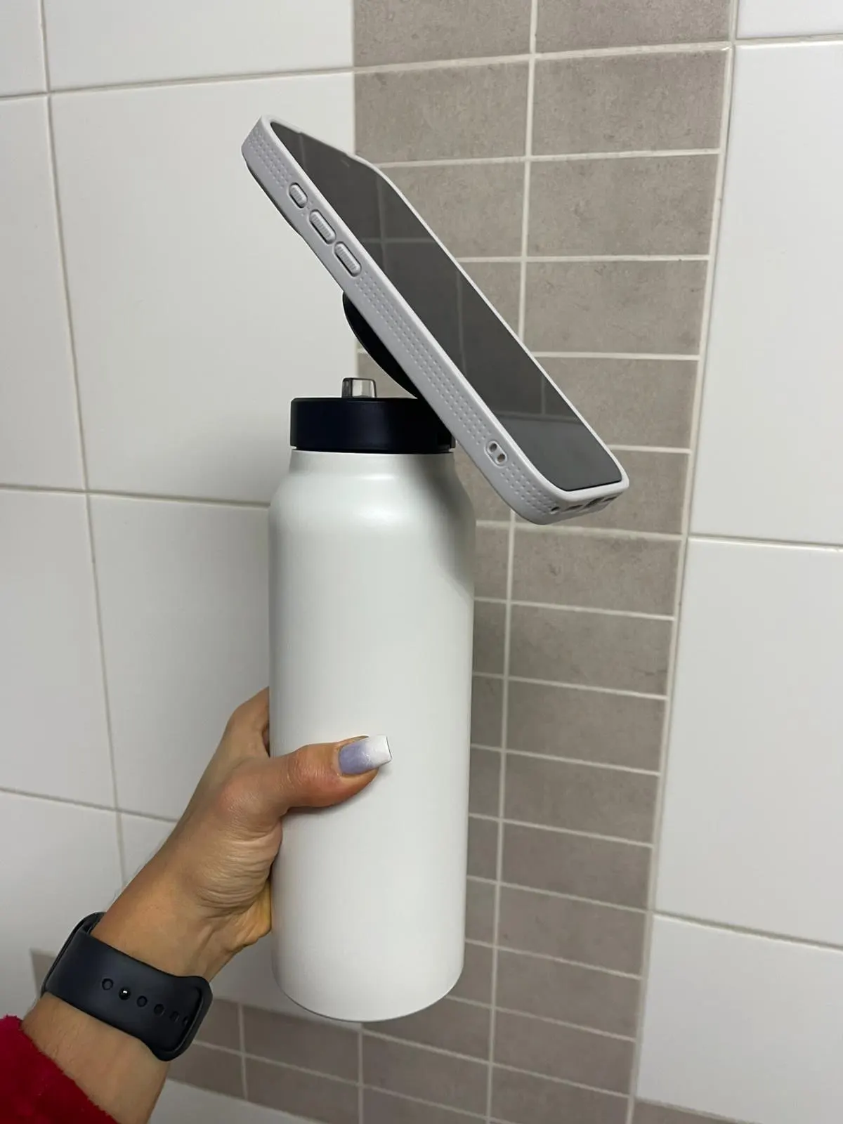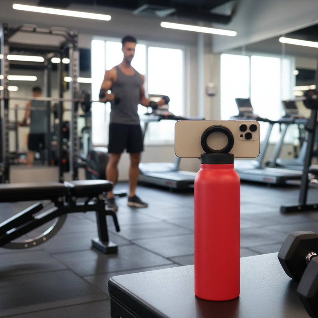 Your smartphone securely attaches to the bottle using a strong magnetic connection, keeping it safe, accessible, and hands-free at all times.